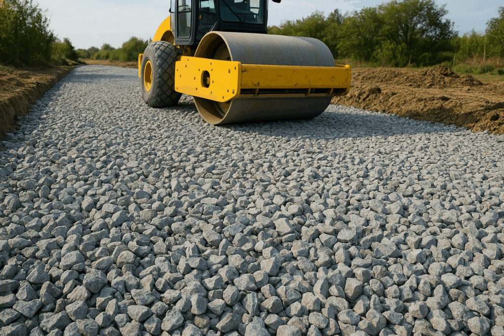 - 駐車場用砕石舗装:中粒~大粒の砕石を使用し、車両の荷重に耐えられる安定性を確保。